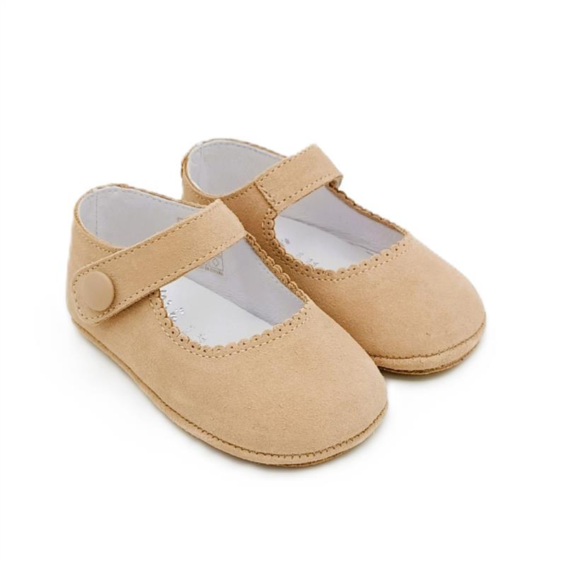 Merceditas de piel serraje Camel con cierre adherente y Semi-suela para bebé. MAMI'S