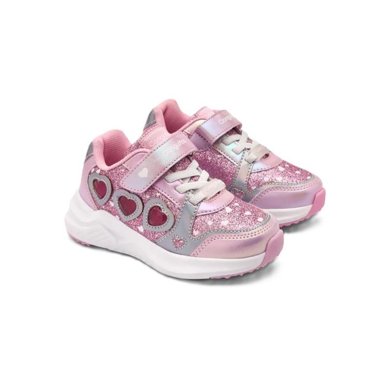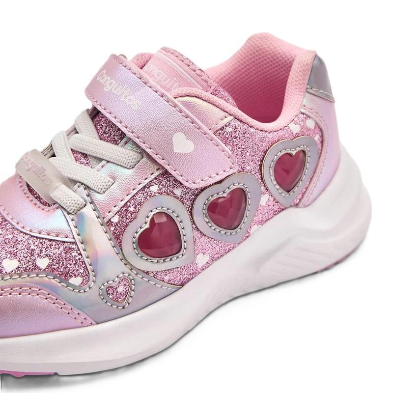 Deportivos glitter con luz y corazones Rosas. Cierre adherente y cordón elástico. CONGUITOS