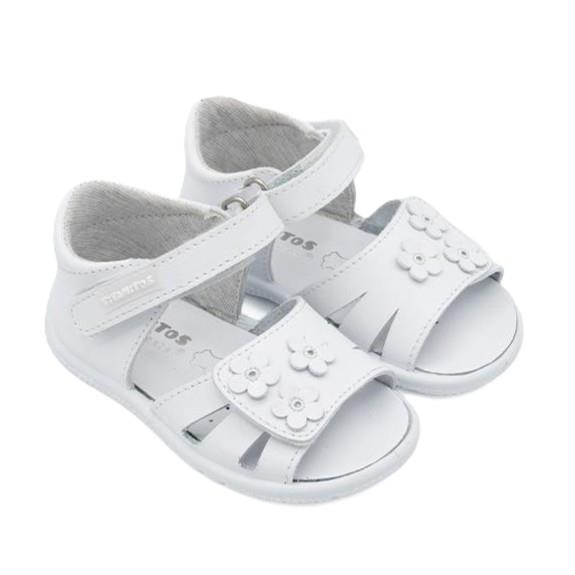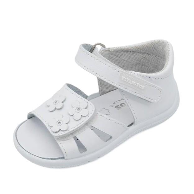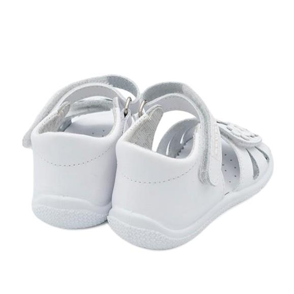 Sandalias de piel lavable Blanca con flores y doble cierre adherente.TITANITOS.